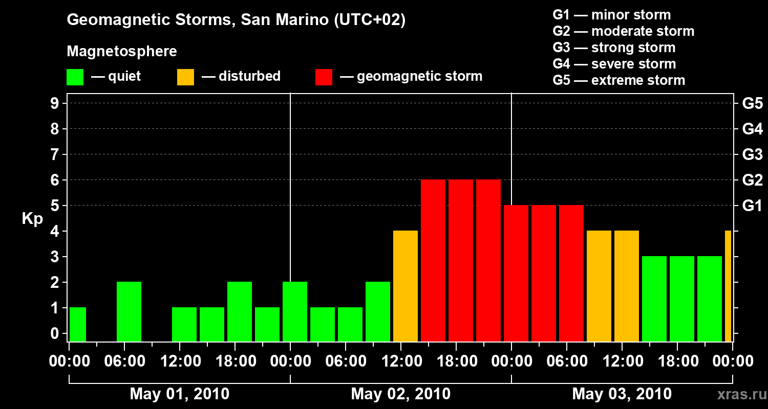 Changes in the geomagnetic index Kp from May 1 to 3, 2010 for mid latitudes