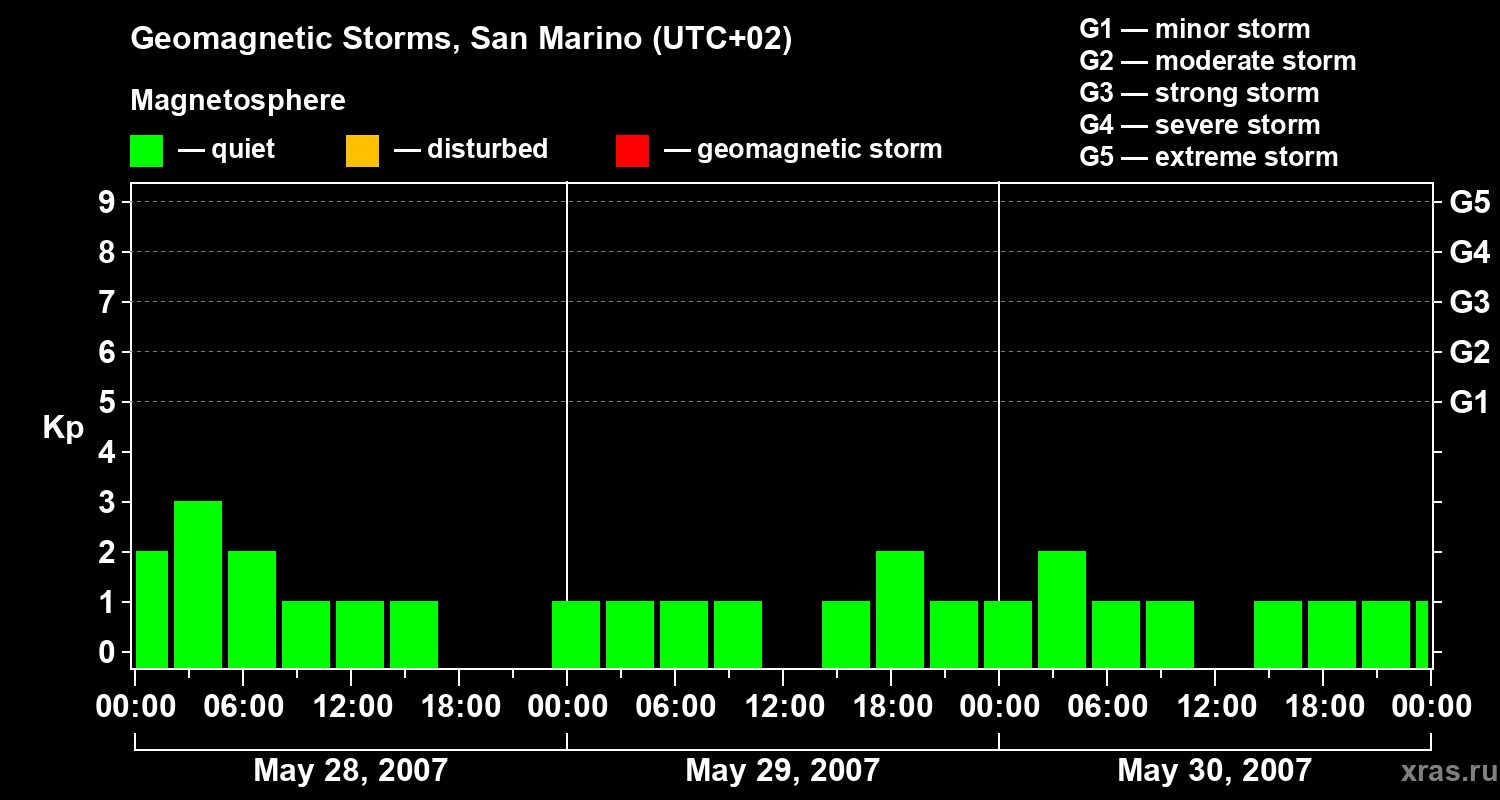 Changes in the geomagnetic index Kp from May 28 to 30, 2007 for mid latitudes
