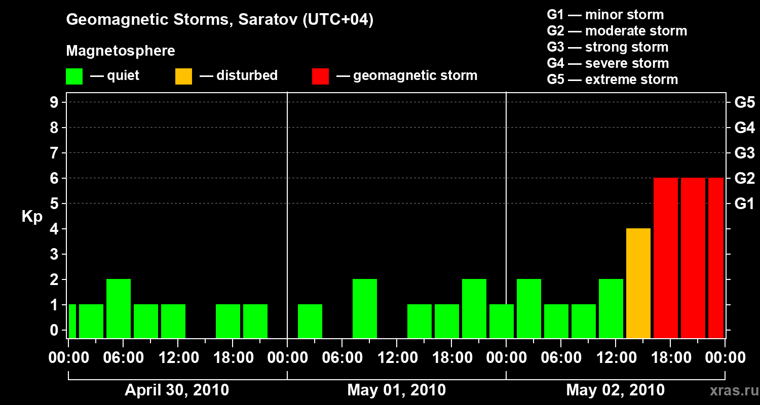 Changes in the geomagnetic index Kp from April 30 to May 2, 2010 for mid latitudes