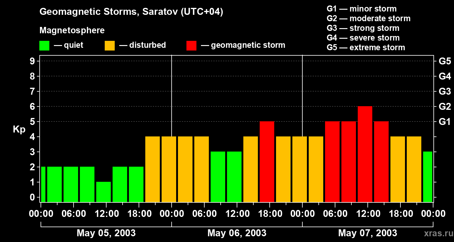 Changes in the geomagnetic index Kp from May 5 to 7, 2003 for mid latitudes