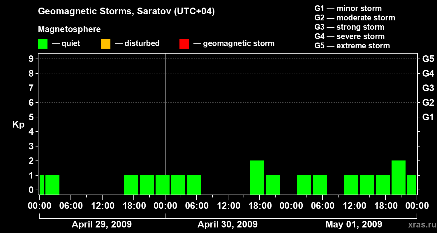 Changes in the geomagnetic index Kp from April 29 to May 1, 2009 for mid latitudes