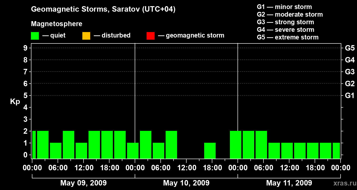 Changes in the geomagnetic index Kp from May 9 to 11, 2009 for mid latitudes