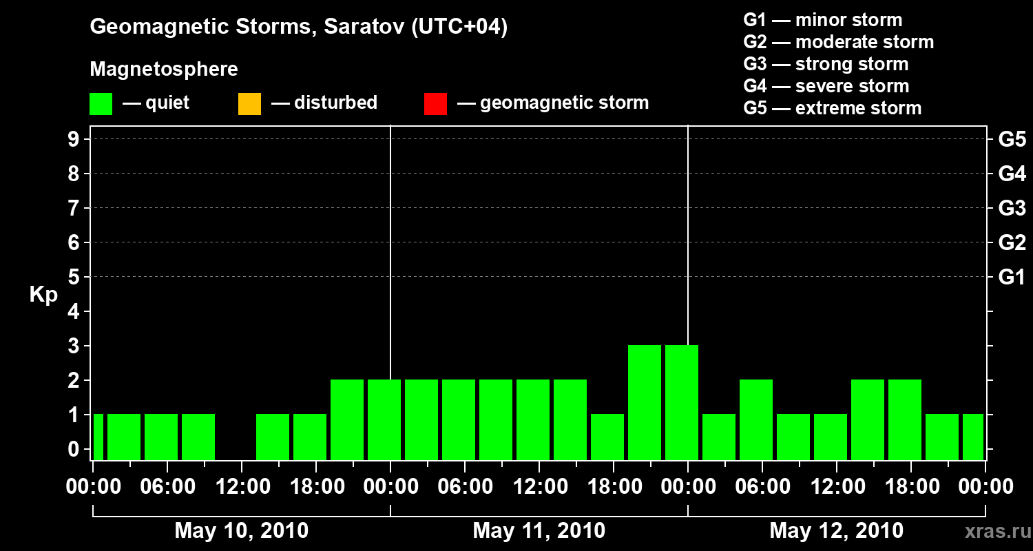 Changes in the geomagnetic index Kp from May 10 to 12, 2010 for mid latitudes