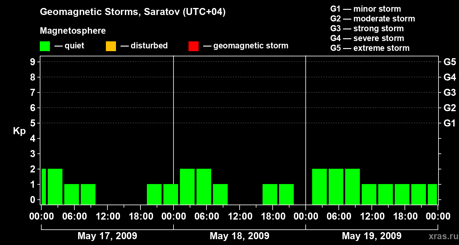 Changes in the geomagnetic index Kp from May 17 to 19, 2009 for mid latitudes