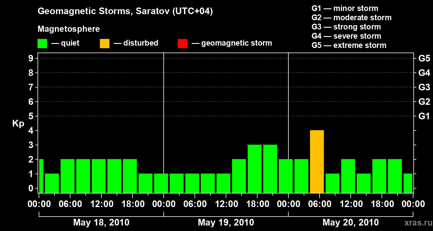 Changes in the geomagnetic index Kp from May 18 to 20, 2010 for mid latitudes