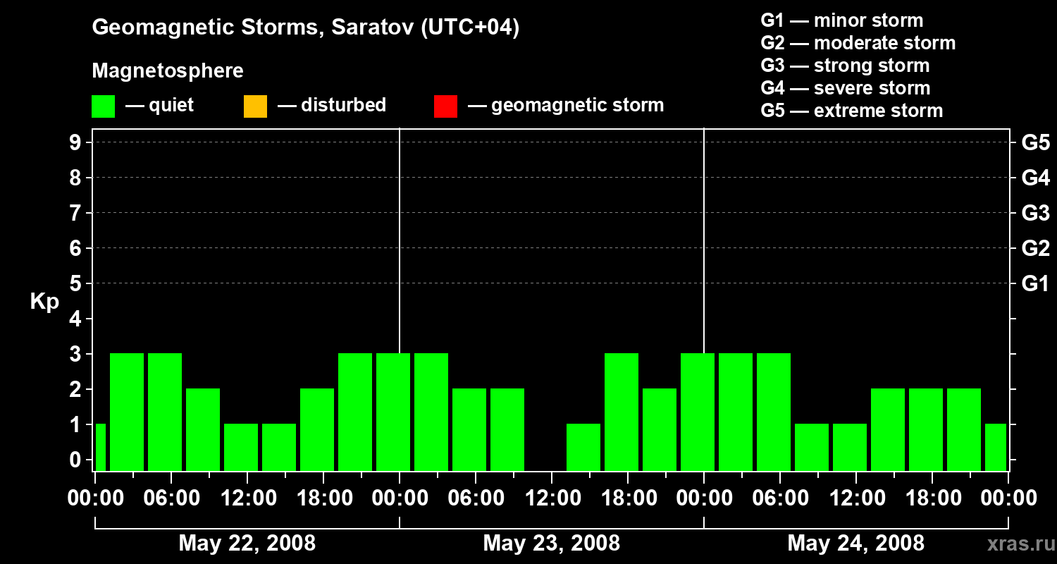 Changes in the geomagnetic index Kp from May 22 to 24, 2008 for mid latitudes