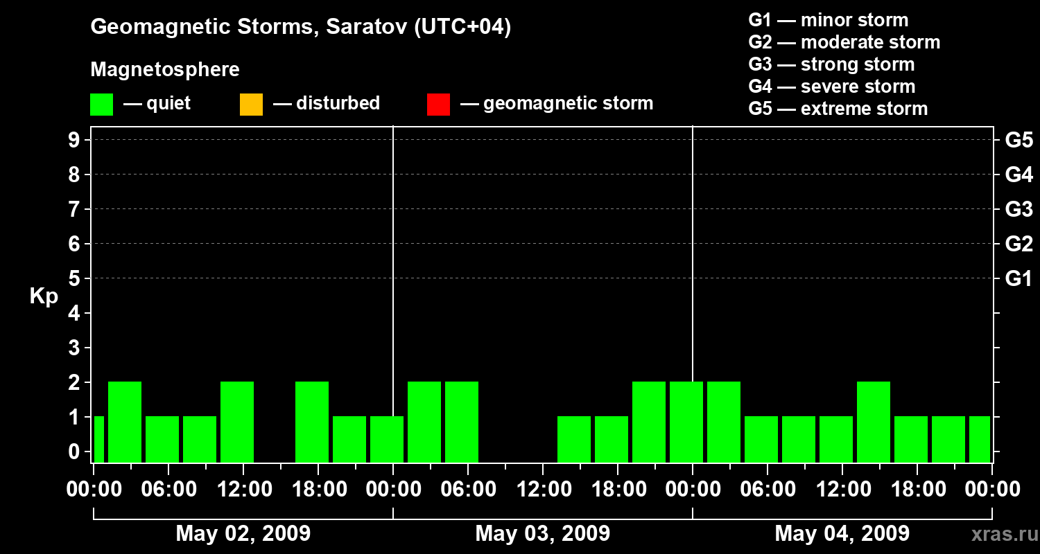 Changes in the geomagnetic index Kp from May 2 to 4, 2009 for mid latitudes