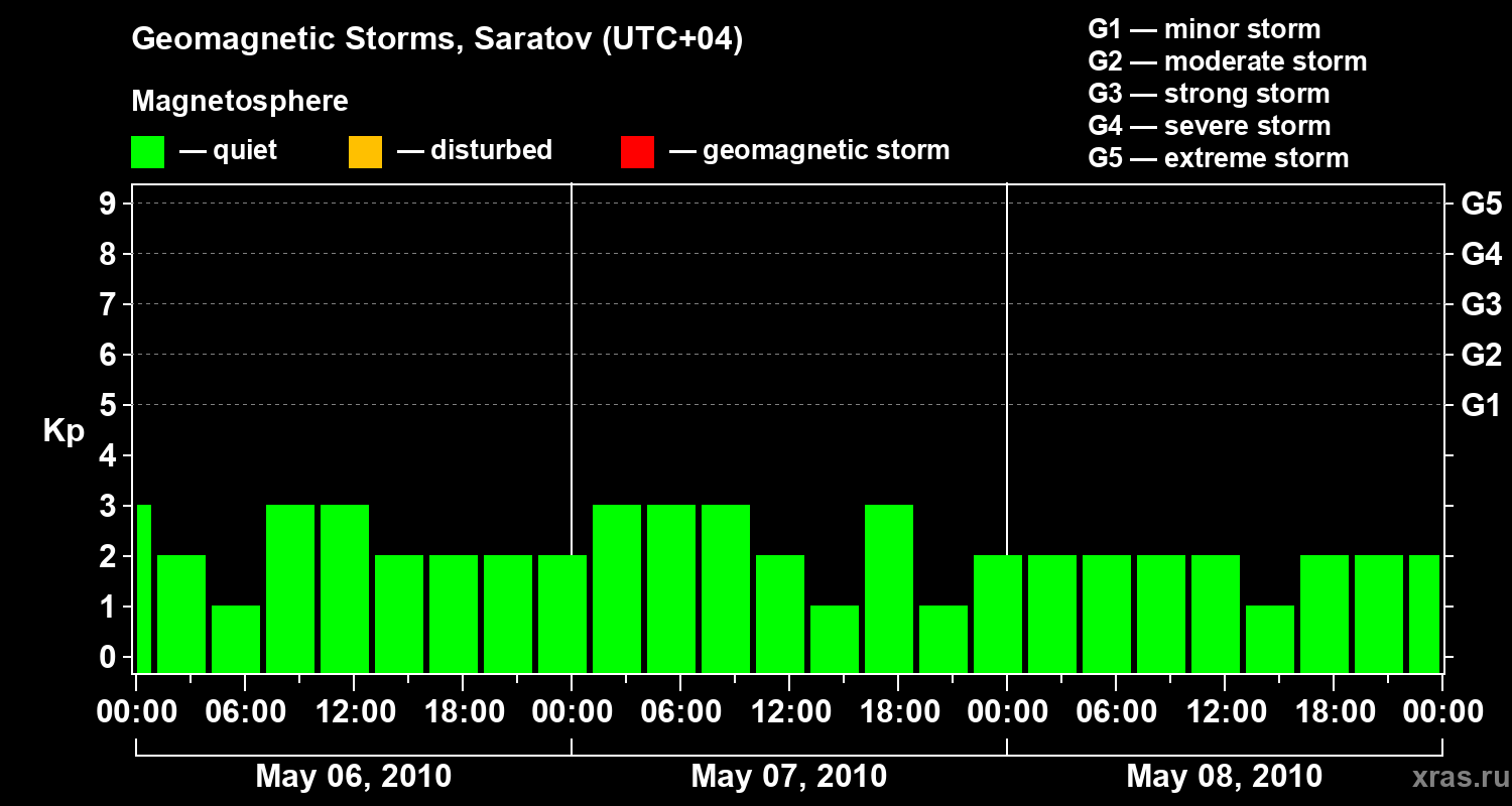 Changes in the geomagnetic index Kp from May 6 to 8, 2010 for mid latitudes