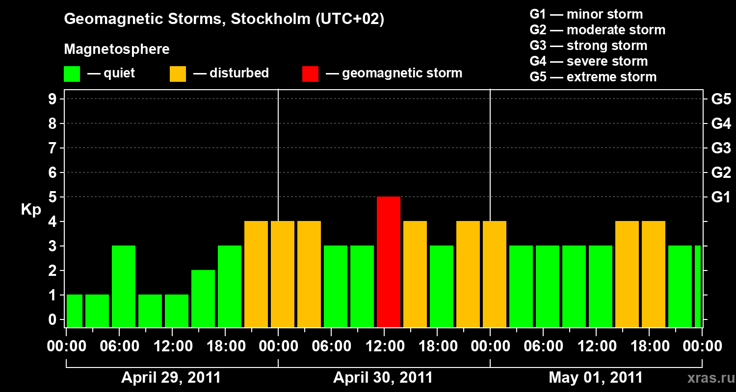 Changes in the geomagnetic index Kp from April 29 to May 1, 2011 for mid latitudes