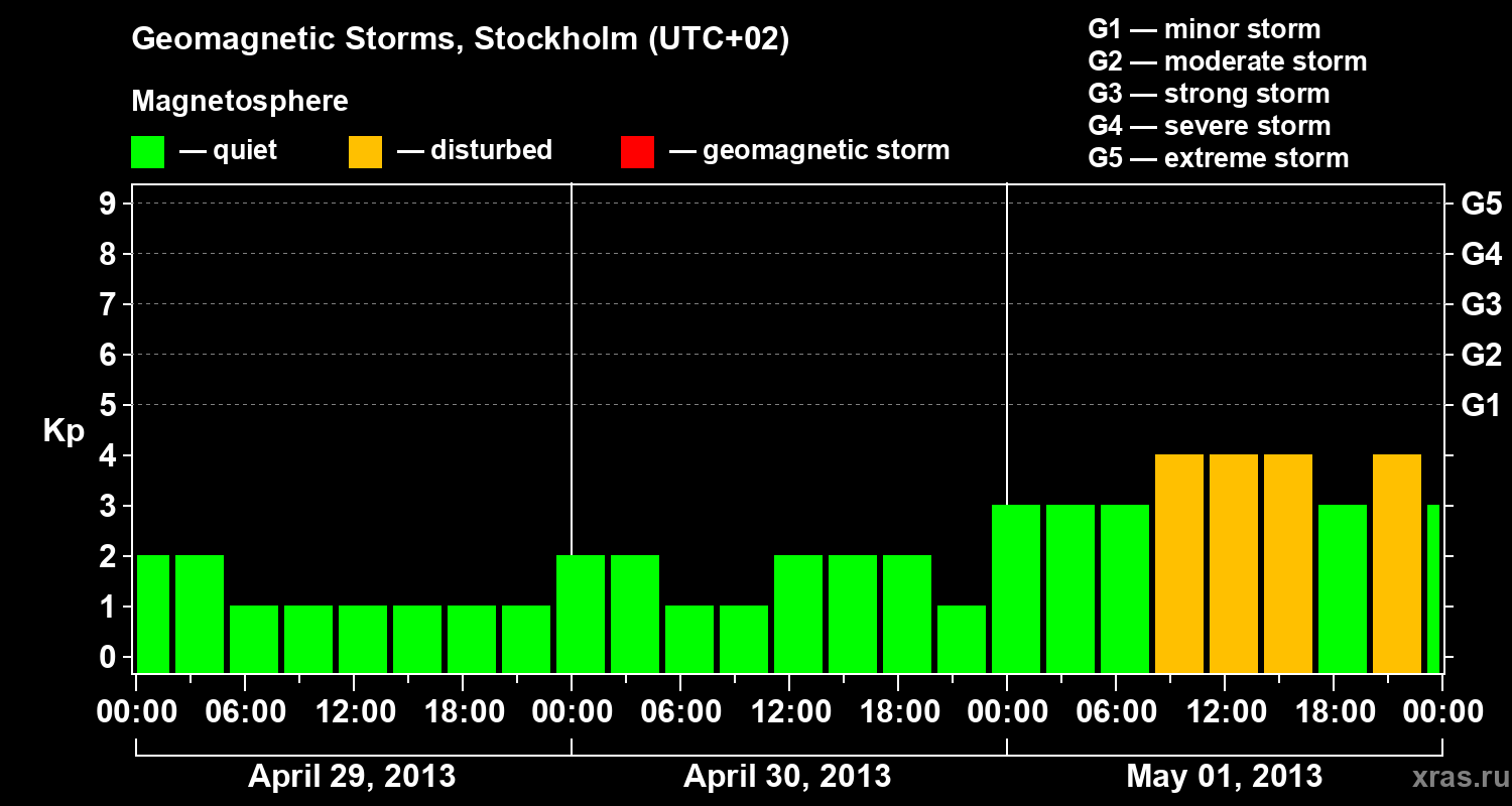 Changes in the geomagnetic index Kp from April 29 to May 1, 2013 for mid latitudes