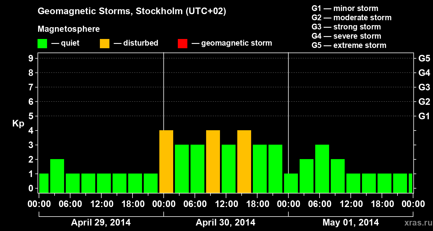 Changes in the geomagnetic index Kp from April 29 to May 1, 2014 for mid latitudes