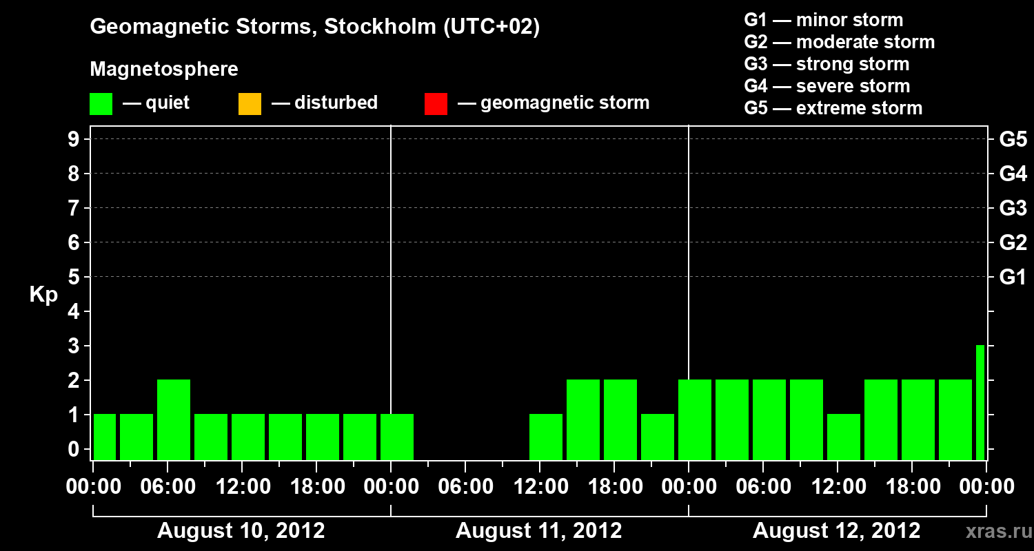 Changes in the geomagnetic index Kp from August 10 to 12, 2012 for mid latitudes