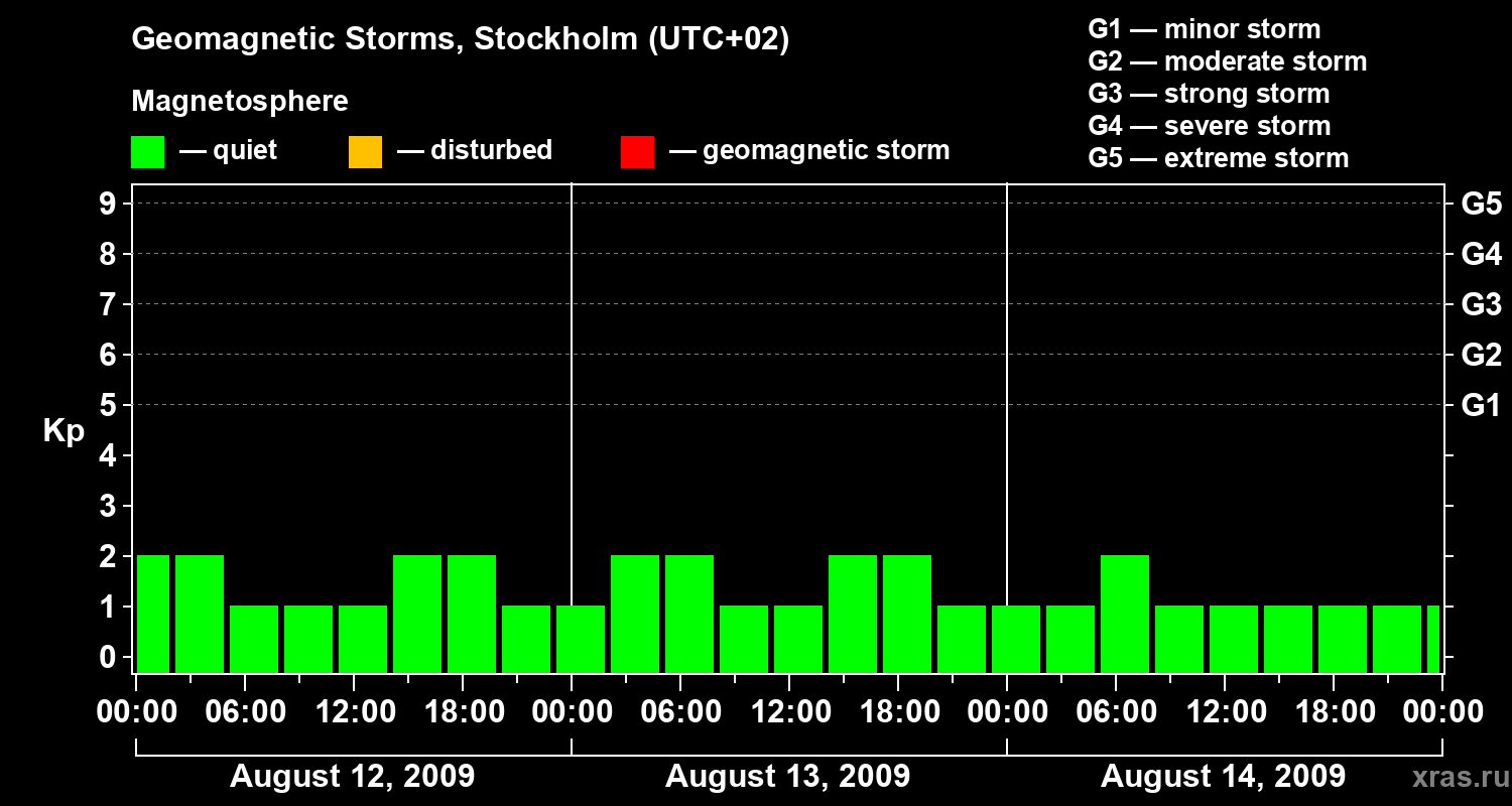 Changes in the geomagnetic index Kp from August 12 to 14, 2009 for mid latitudes