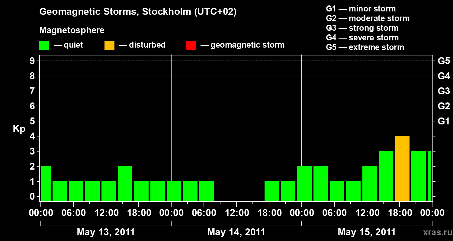 Changes in the geomagnetic index Kp from May 13 to 15, 2011 for mid latitudes