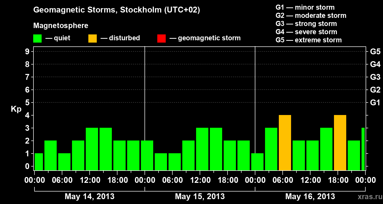 Changes in the geomagnetic index Kp from May 14 to 16, 2013 for mid latitudes