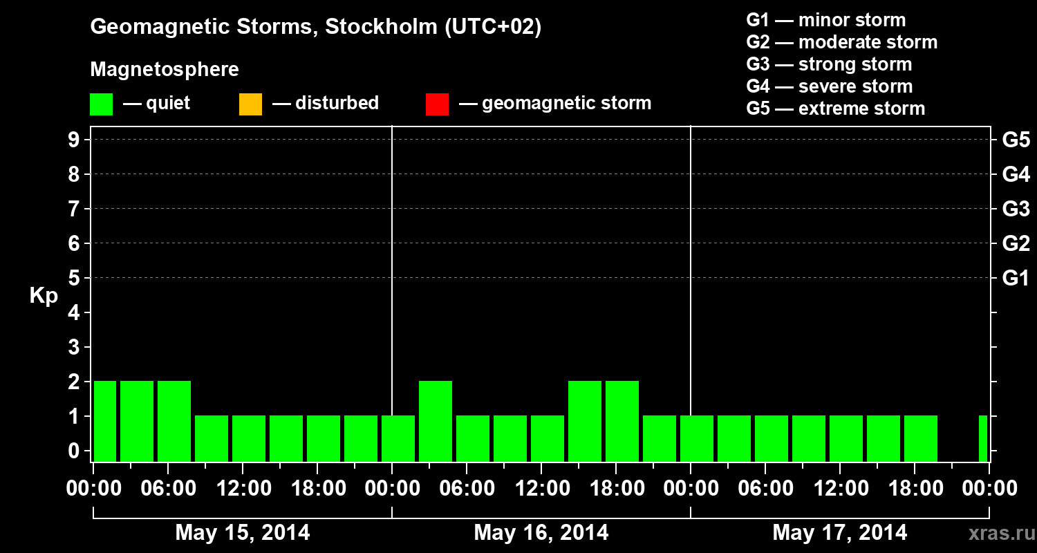Changes in the geomagnetic index Kp from May 15 to 17, 2014 for mid latitudes