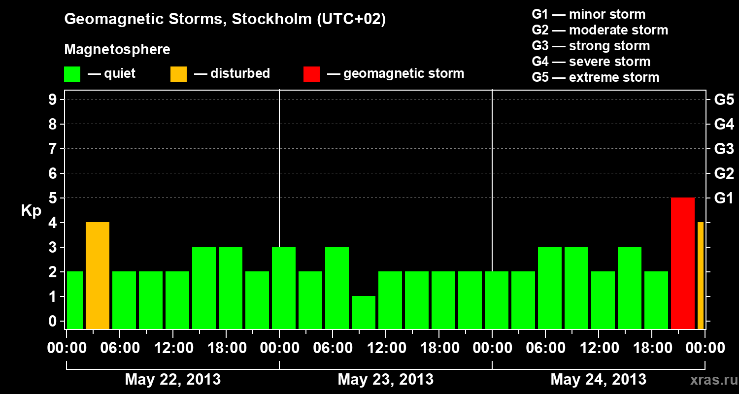 Changes in the geomagnetic index Kp from May 22 to 24, 2013 for mid latitudes