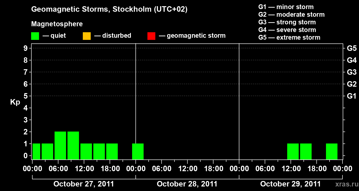 Changes in the geomagnetic index Kp from October 27 to 29, 2011 for mid latitudes