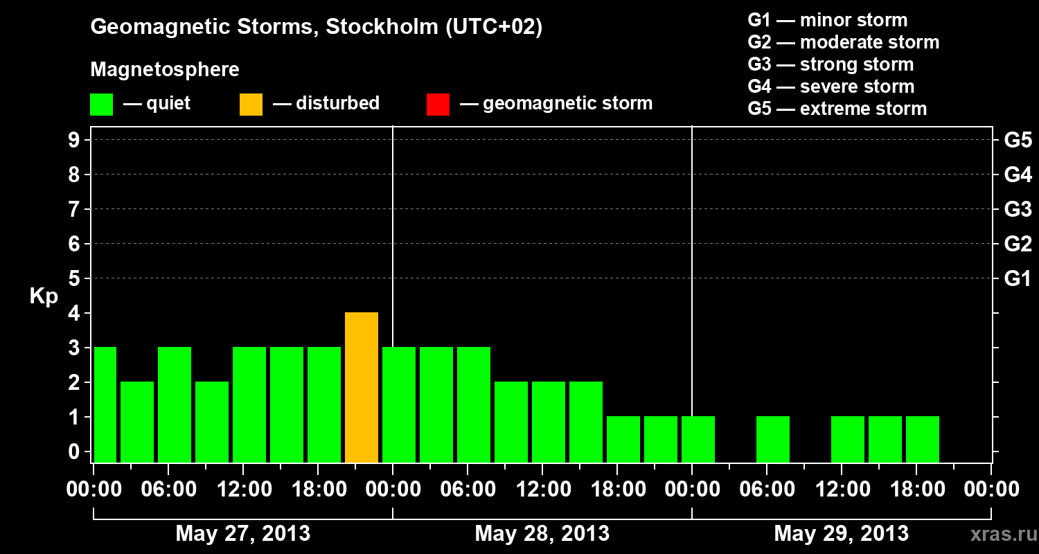 Changes in the geomagnetic index Kp from May 27 to 29, 2013 for mid latitudes
