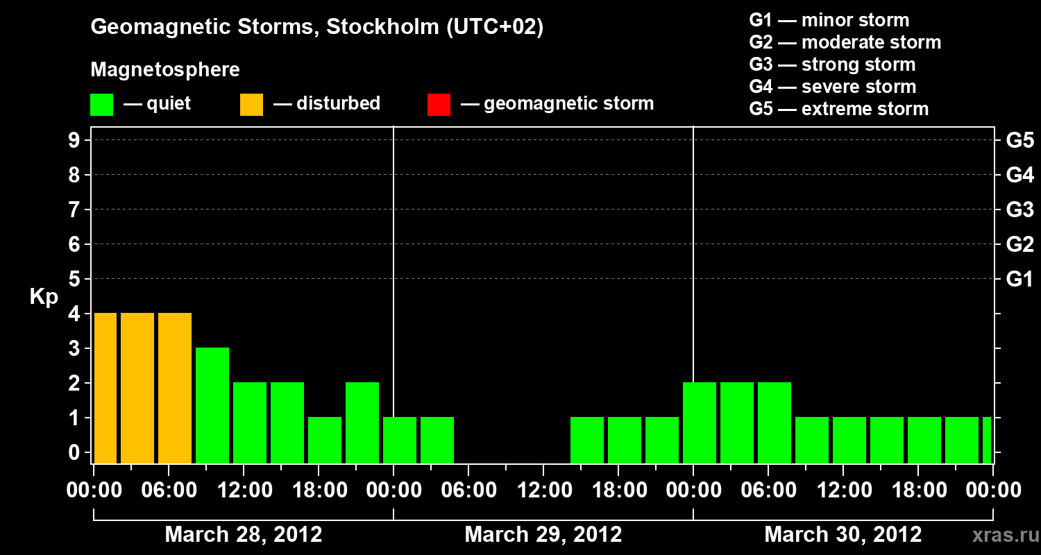 Changes in the geomagnetic index Kp from March 28 to 30, 2012 for mid latitudes