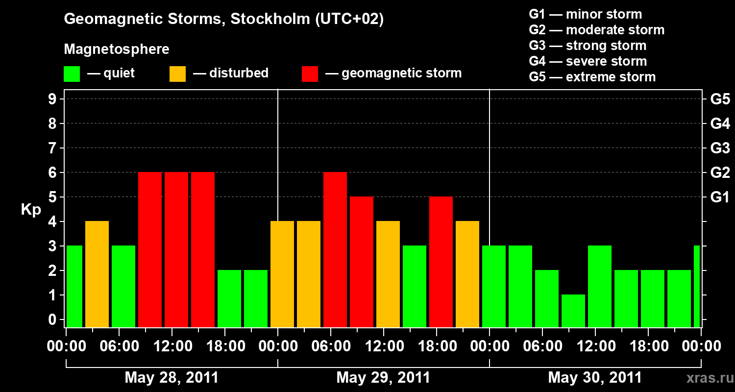 Changes in the geomagnetic index Kp from May 28 to 30, 2011 for mid latitudes