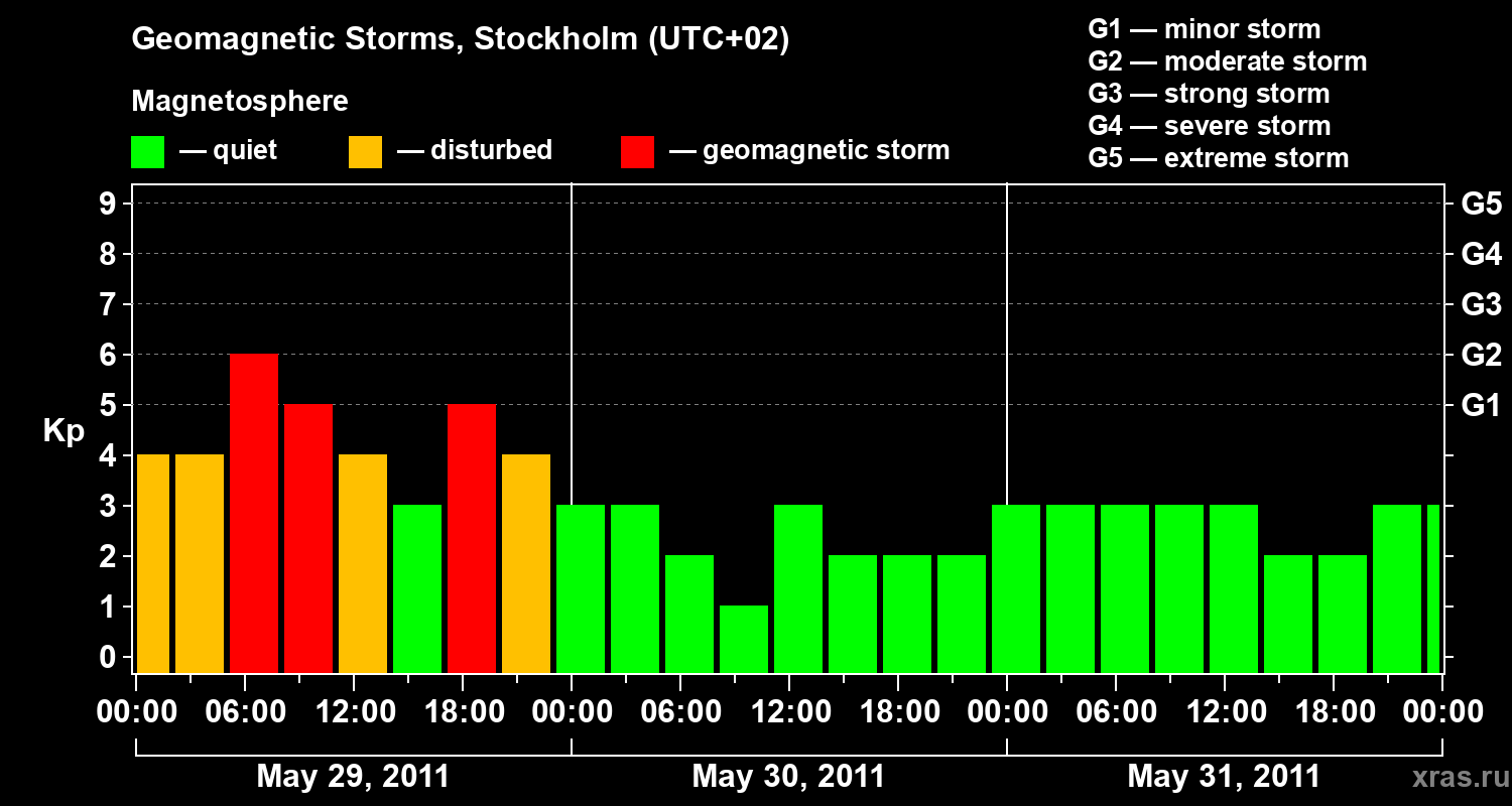 Changes in the geomagnetic index Kp from May 29 to 31, 2011 for mid latitudes