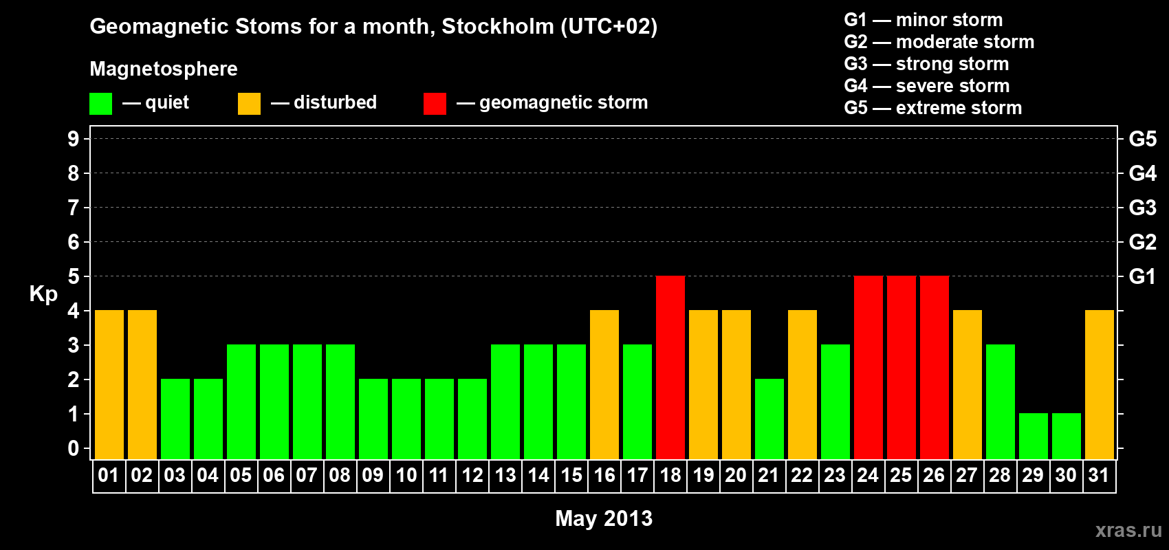 Changes in the maximum daily geomagnetic index Kp in May 2013 for mid latitudes