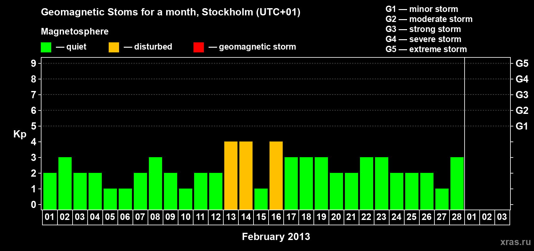 There were no days with an increased level of geomagnetic disturbance in February 2013