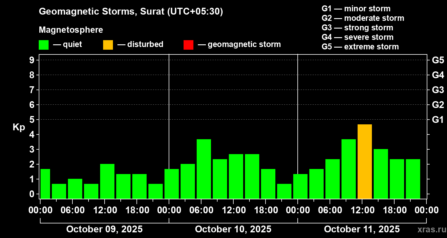 Changes in the geomagnetic index Kp from October 9 to 11, 2025 for mid latitudes