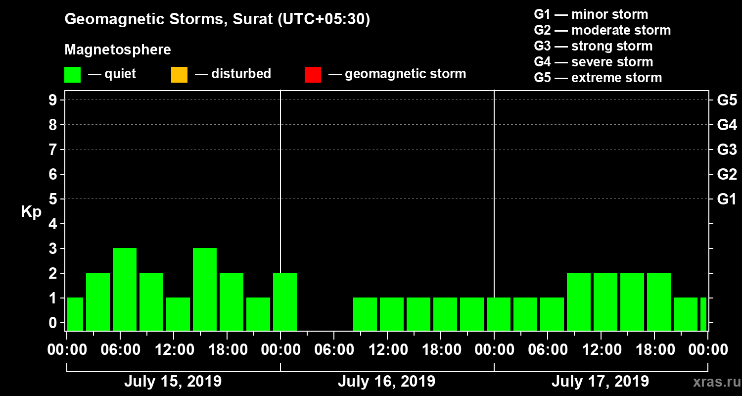Changes in the geomagnetic index Kp from July 15 to 17, 2019 for mid latitudes
