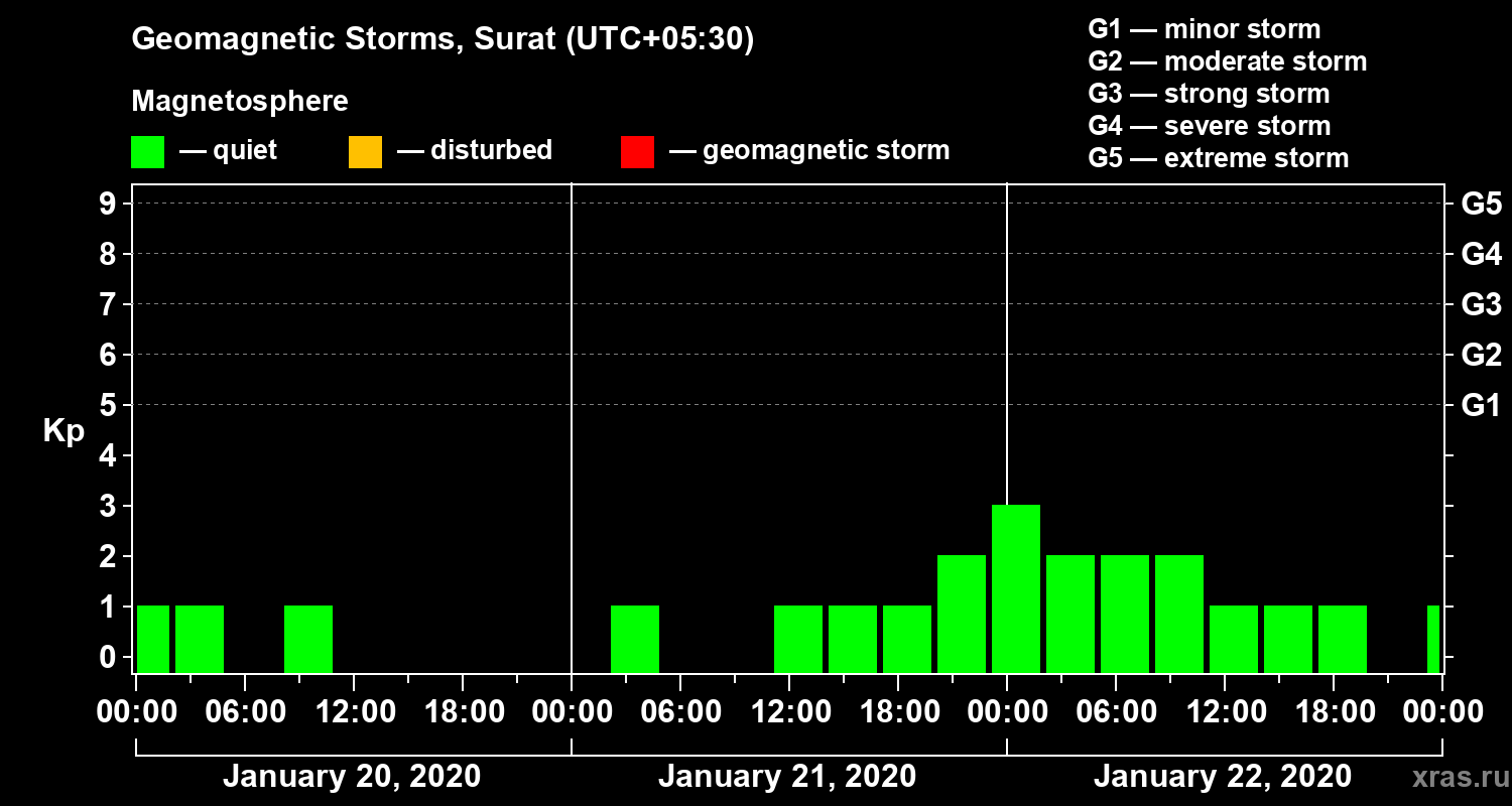 Changes in the geomagnetic index Kp from January 20 to 22, 2020 for mid latitudes