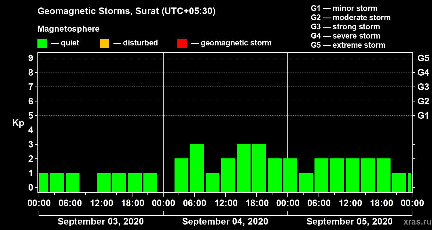 Changes in the geomagnetic index Kp from September 3 to 5, 2020 for mid latitudes