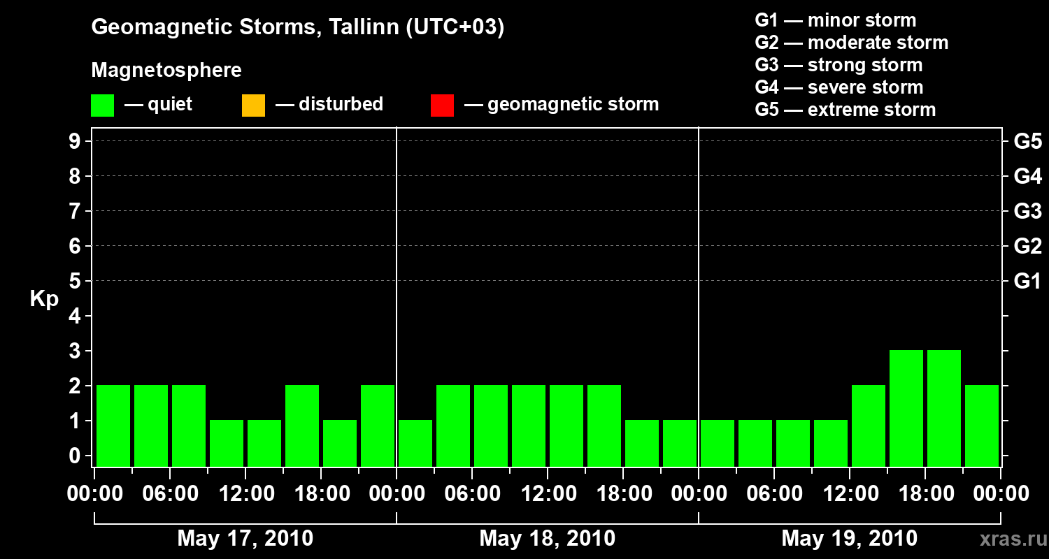 Changes in the geomagnetic index Kp from May 17 to 19, 2010 for mid latitudes