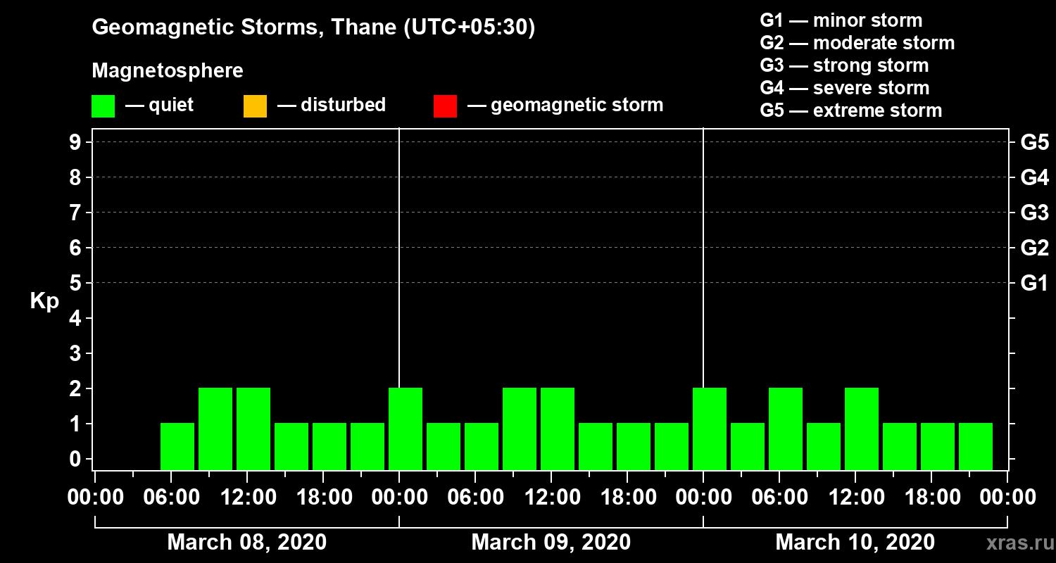 Changes in the geomagnetic index Kp from March 8 to 10, 2020 for mid latitudes