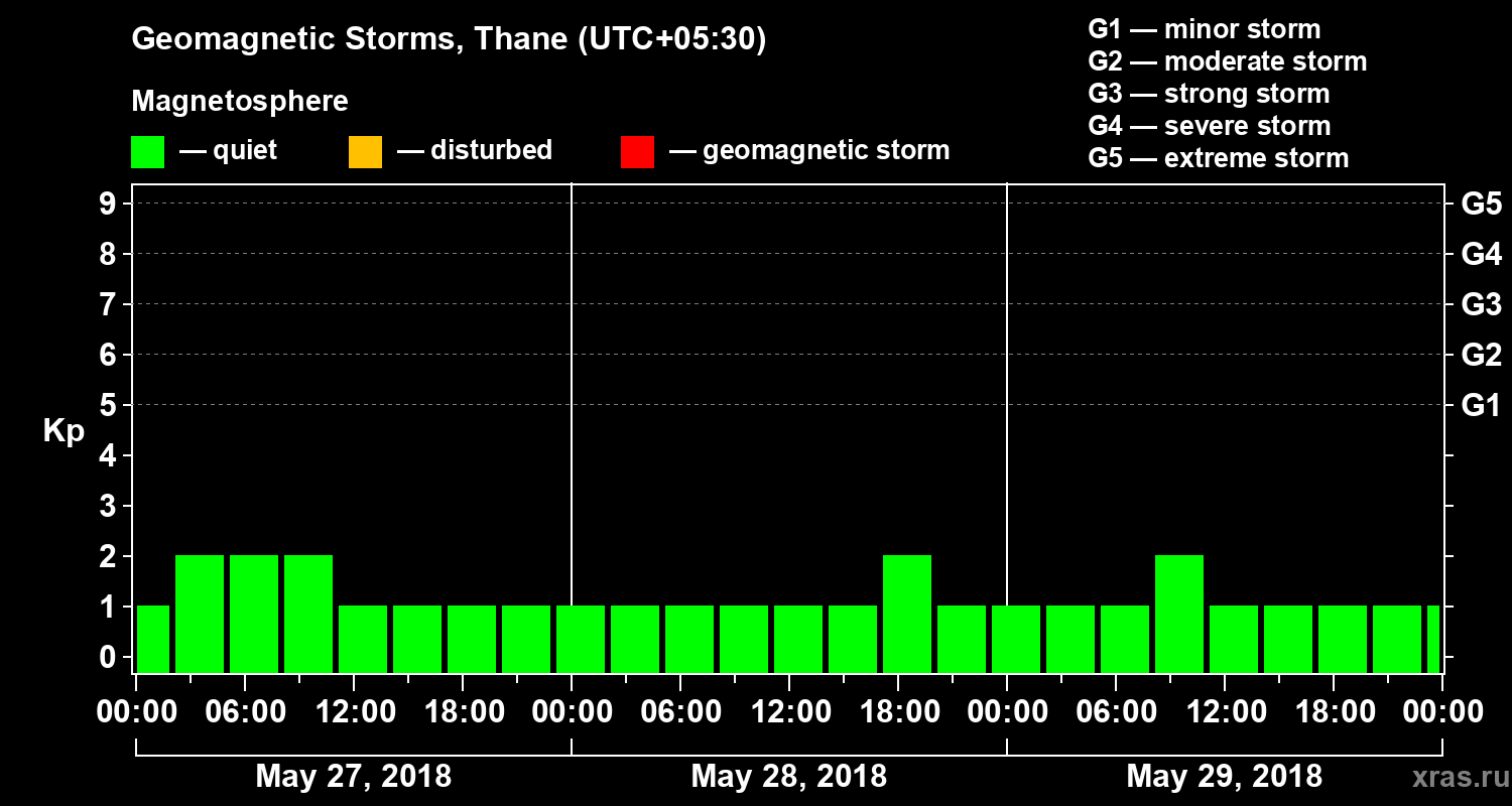 Changes in the geomagnetic index Kp from May 27 to 29, 2018 for mid latitudes