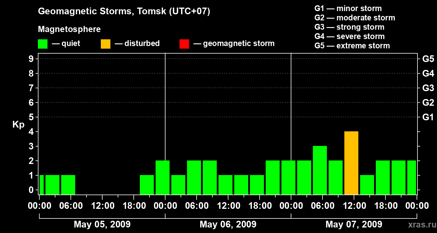 Changes in the geomagnetic index Kp from May 5 to 7, 2009 for mid latitudes