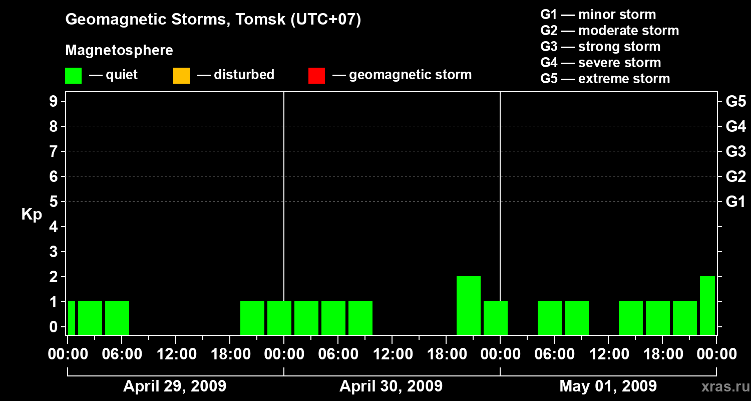 Changes in the geomagnetic index Kp from April 29 to May 1, 2009 for mid latitudes