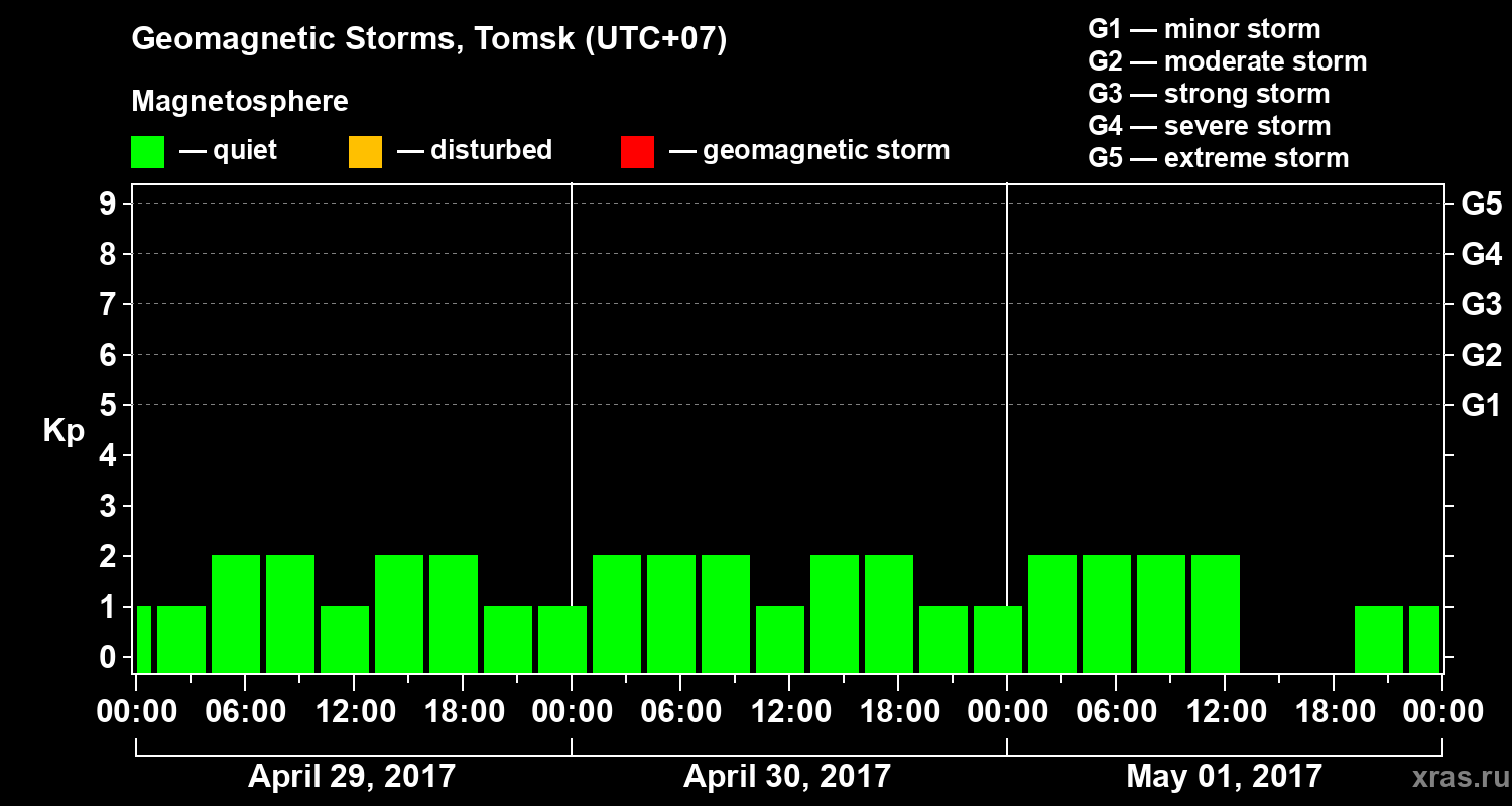 Changes in the geomagnetic index Kp from April 29 to May 1, 2017 for mid latitudes