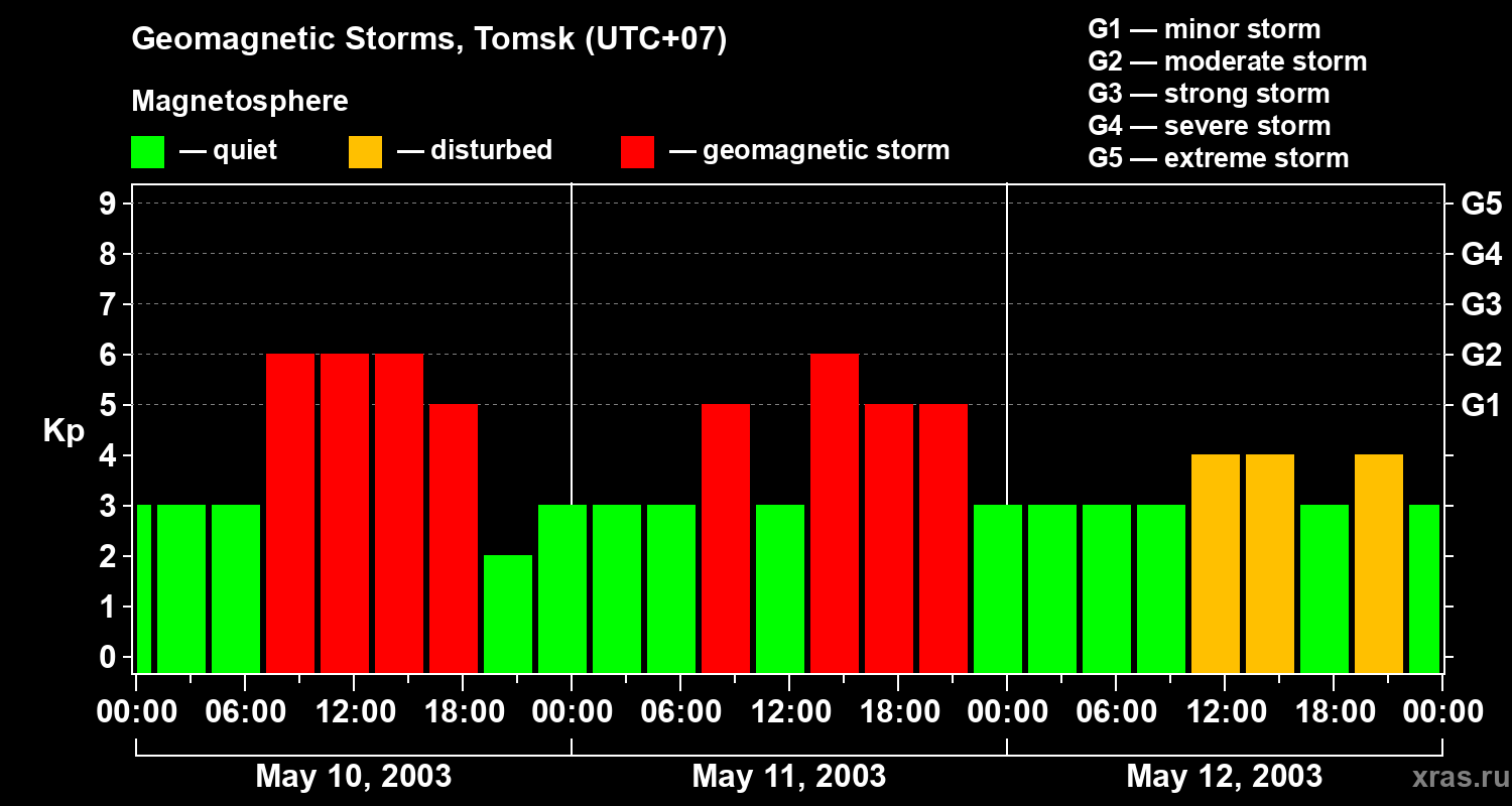 Changes in the geomagnetic index Kp from May 10 to 12, 2003 for mid latitudes