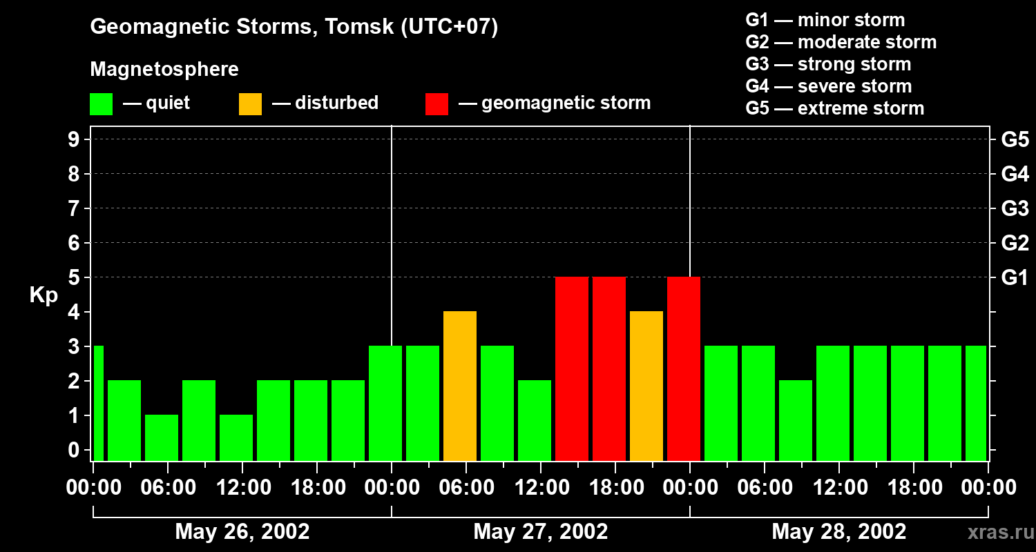 Changes in the geomagnetic index Kp from May 26 to 28, 2002 for mid latitudes