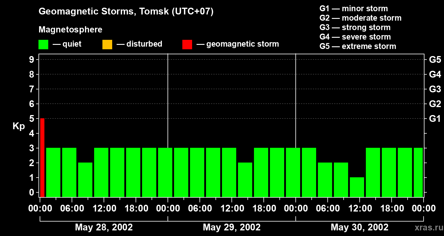 Changes in the geomagnetic index Kp from May 28 to 30, 2002 for mid latitudes