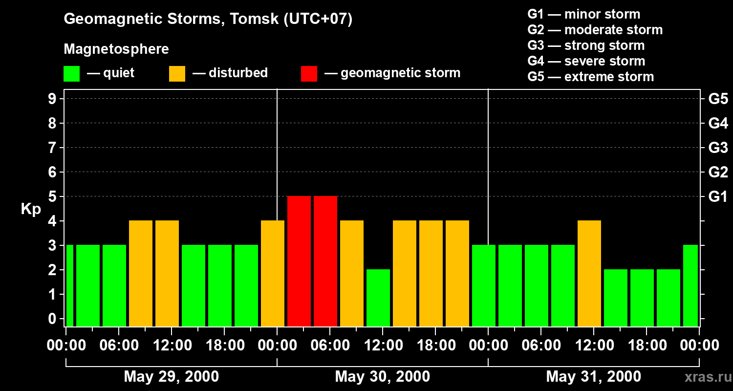 Changes in the geomagnetic index Kp from May 29 to 31, 2000 for mid latitudes