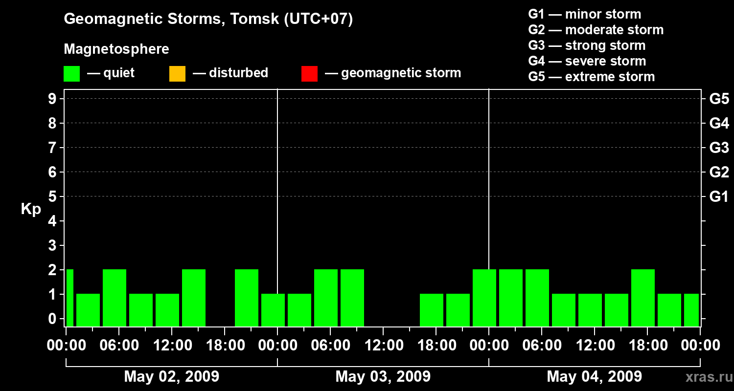 Changes in the geomagnetic index Kp from May 2 to 4, 2009 for mid latitudes