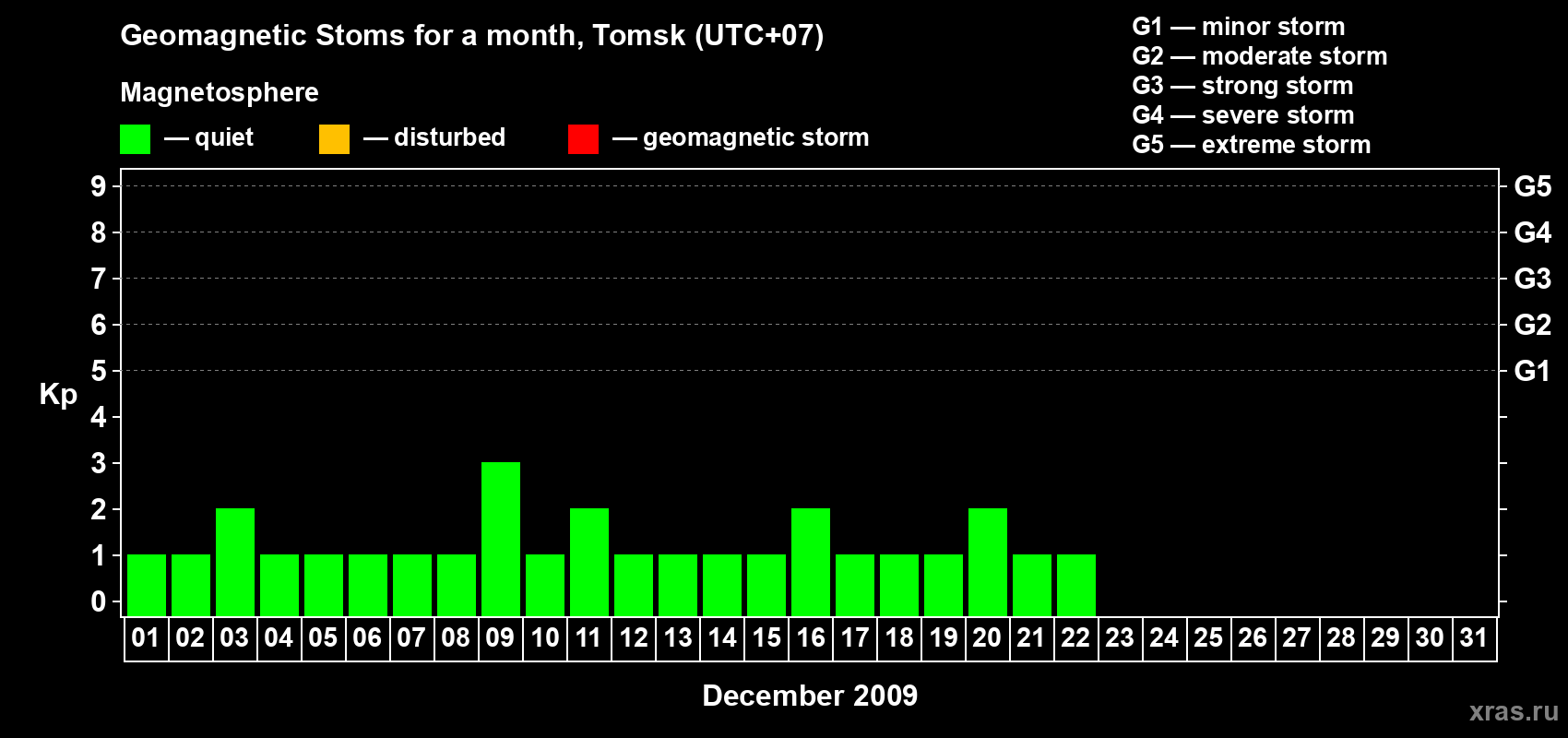 There were no days with an increased level of geomagnetic disturbance in December 2009
