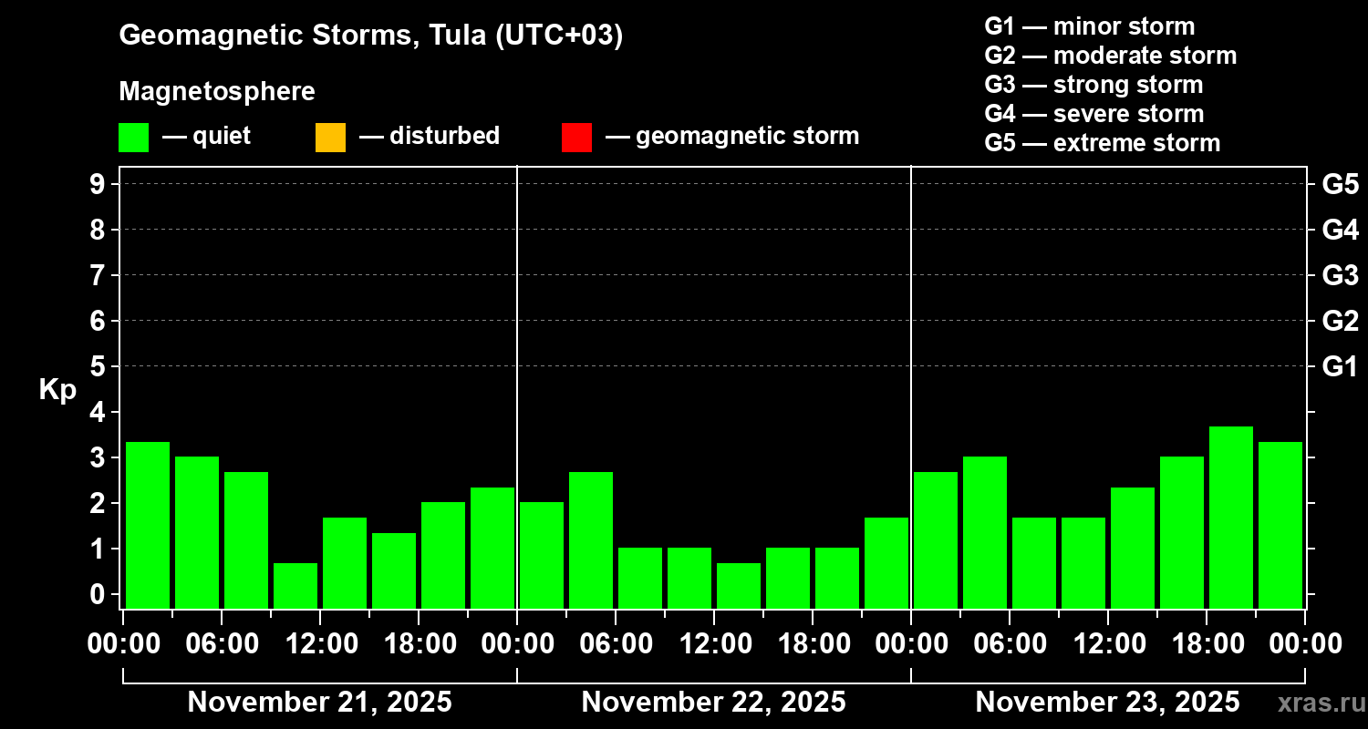 Changes in the geomagnetic index Kp from November 21 to 23, 2025 for mid latitudes