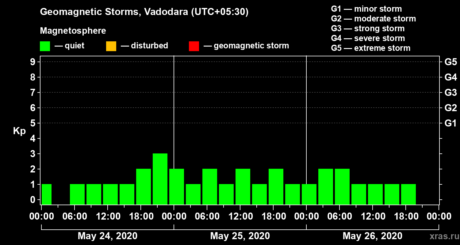 Changes in the geomagnetic index Kp from May 24 to 26, 2020 for mid latitudes
