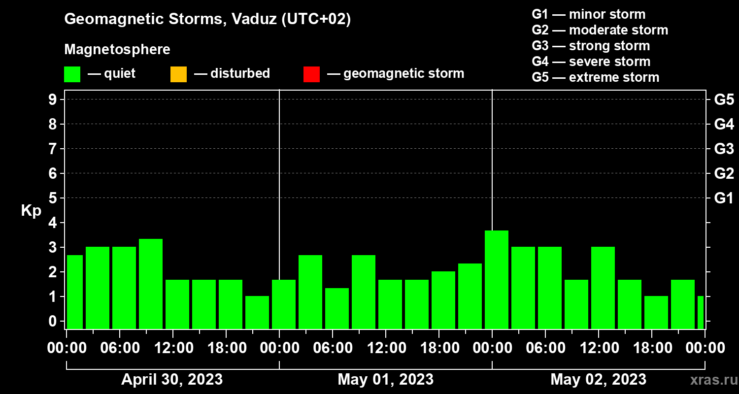 Changes in the geomagnetic index Kp from April 30 to May 2, 2023 for mid latitudes