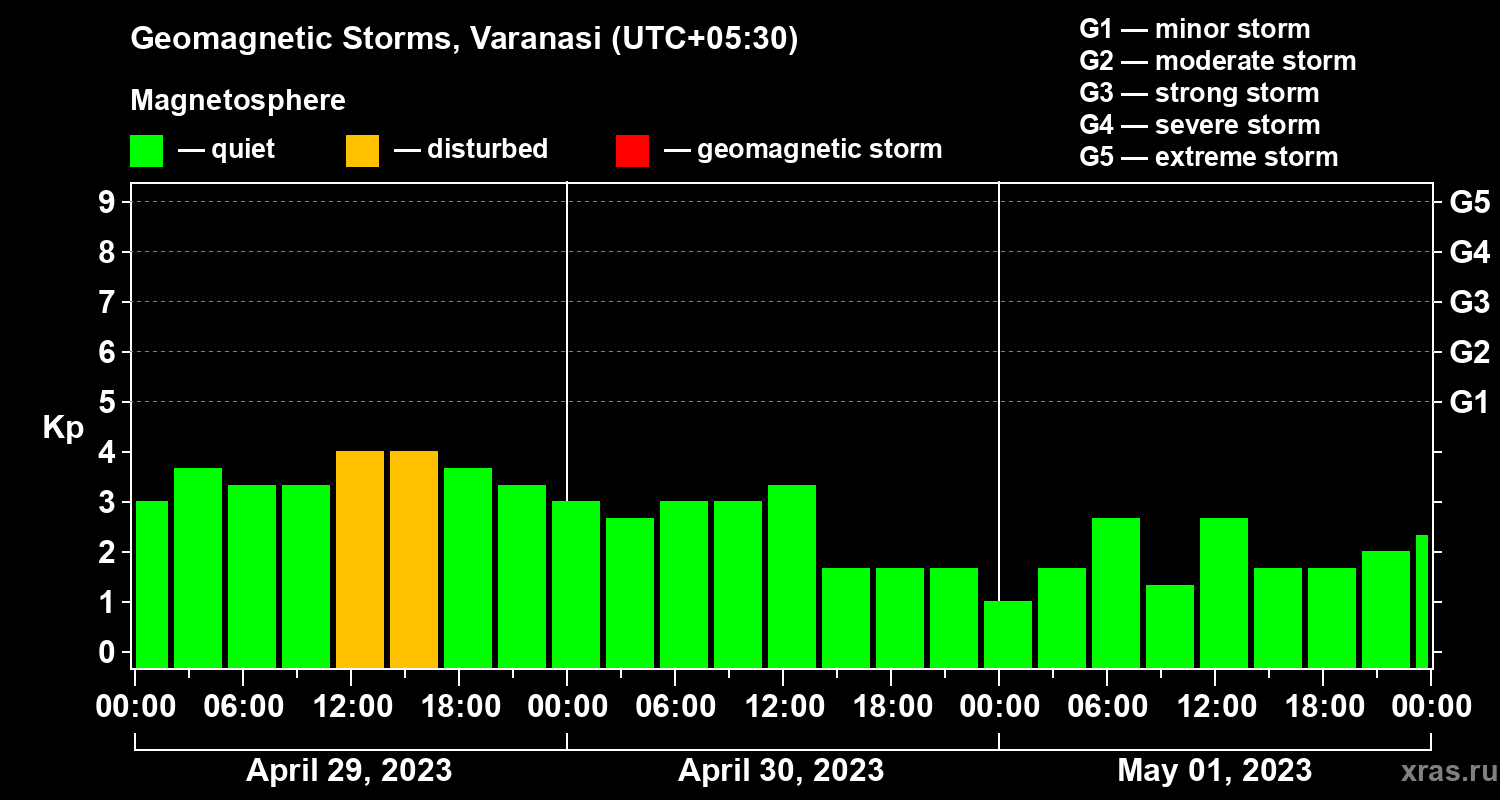 Changes in the geomagnetic index Kp from April 29 to May 1, 2023 for mid latitudes