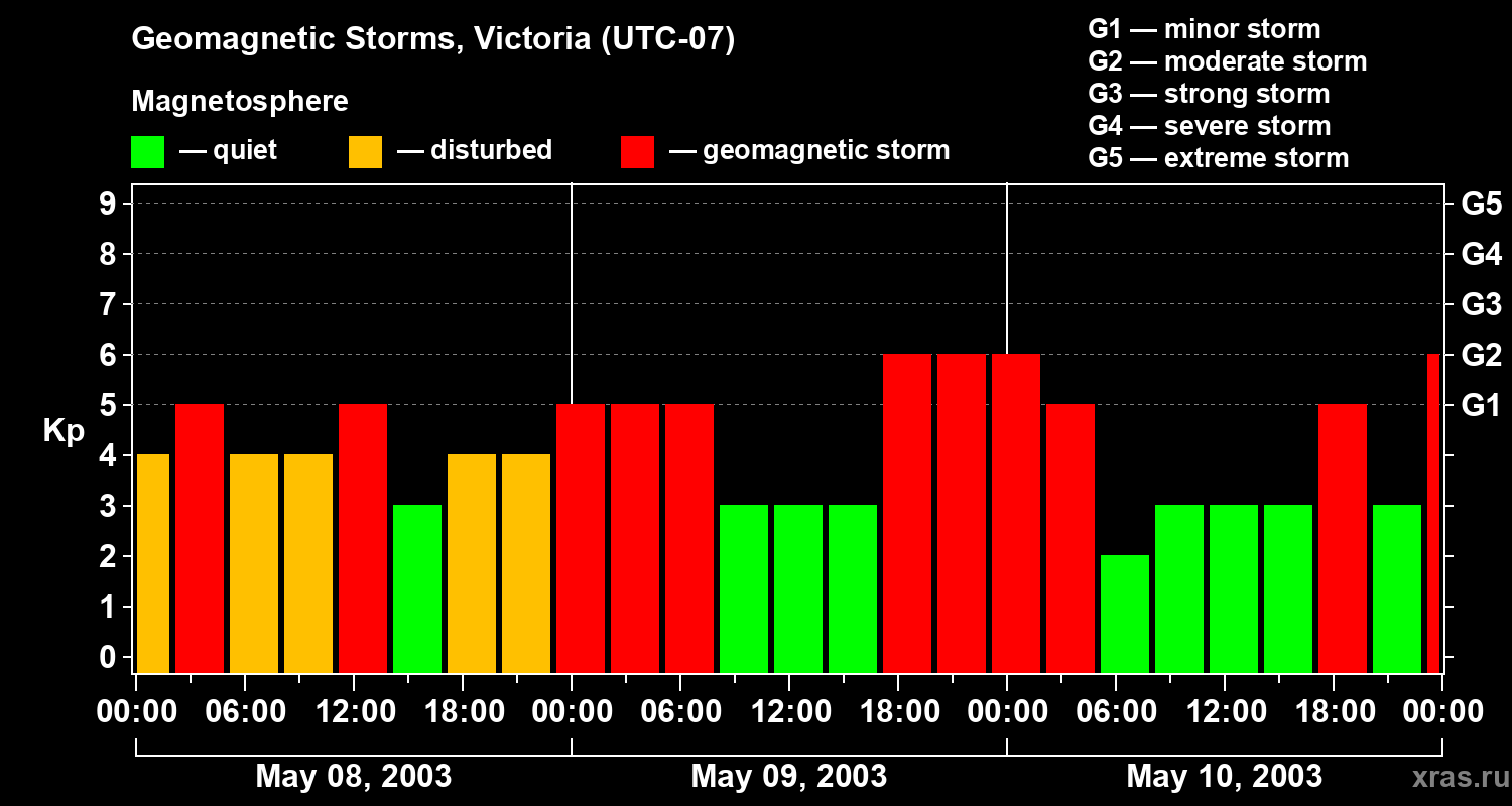 Changes in the geomagnetic index Kp from May 8 to 10, 2003 for mid latitudes