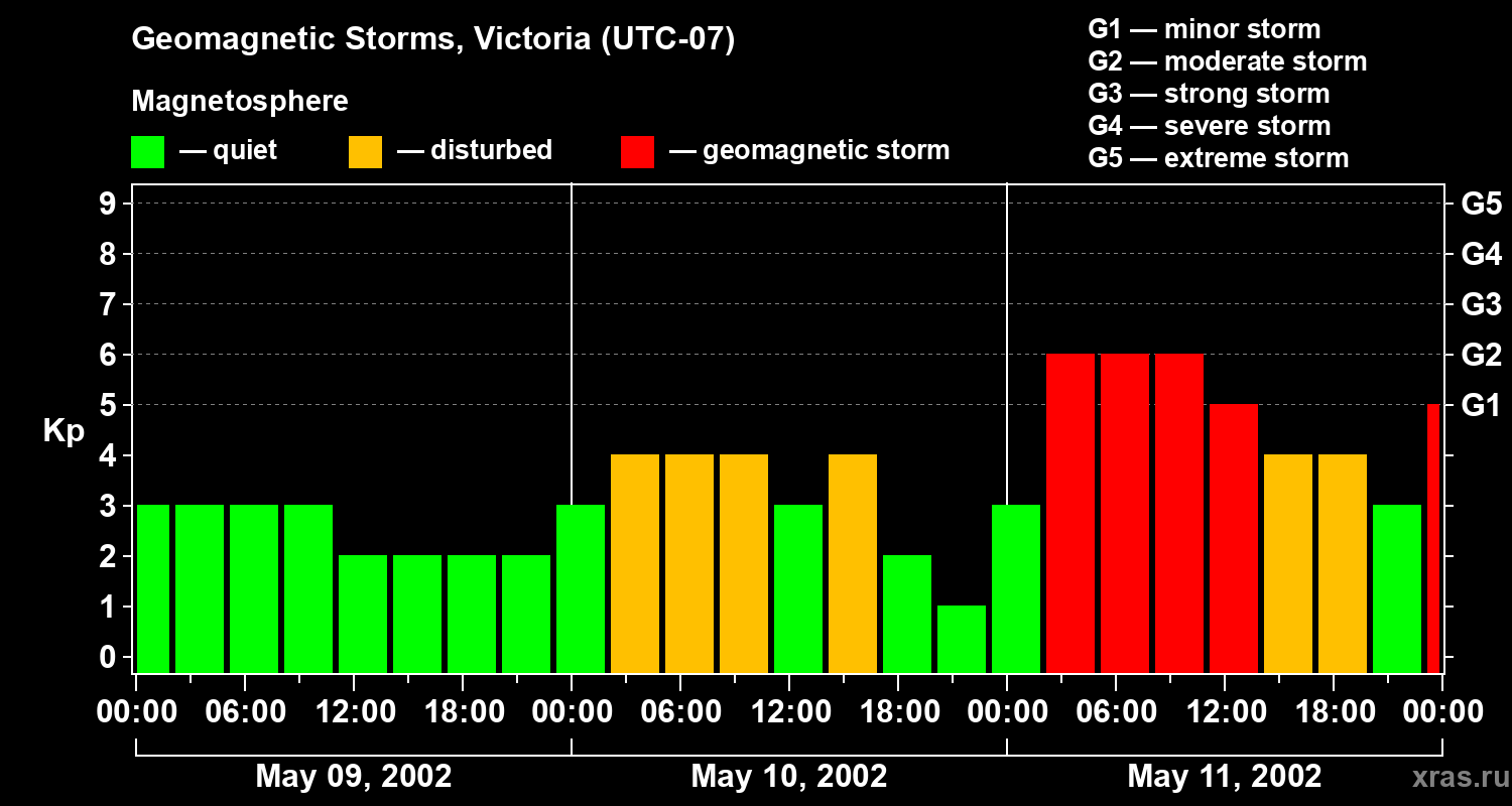 Changes in the geomagnetic index Kp from May 9 to 11, 2002 for mid latitudes